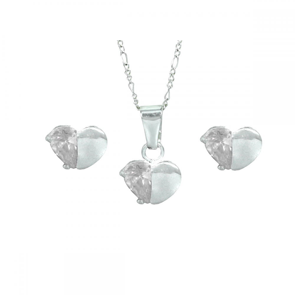 Juego de Plata con zirconias en forma de corazón con cadena, broqueles con perno de mariposa, dije de 11mm de diámetro y cadena de 45cm de largo. (medidas aproximadas)